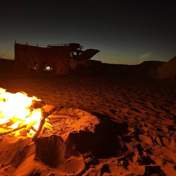 A desert support team travels with you and a support vehicle meets the camp daily for water food safety and camping equipment